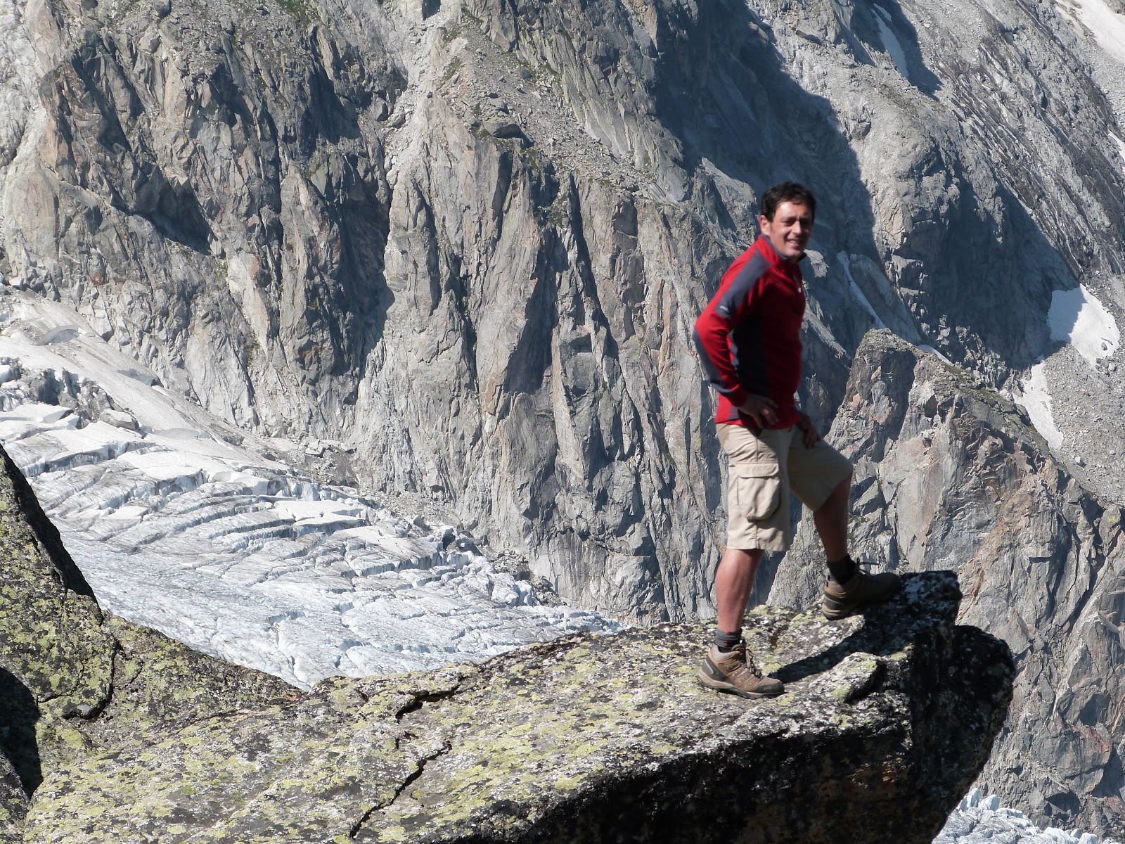 En este punto cruzamos la frontera por primera vez admiramos bajo nuestros pies "la bella Italia". Vemos al fondo del valle la morrena del glaciar de Miage y sobre el mapa decidimos cruzarlo e intentar subir al refugio Monzino. Y bien digo sobre el mapa porque en la realidad la senda que lo cruza es inexistente y debemos abrirnos paso a base de gps e intentar no quedarnos bloqueados en estas moles de hielo y piedra. Es nuestra primera experiencia en glaciar y la sensación es espeluznante, realmente está vivo, gracias a nuestro instinto y a nuestra experiencia en la montaña encontramos el camino que nos permite atravesarlo, no sin antes pasar algún que otro apuro.
